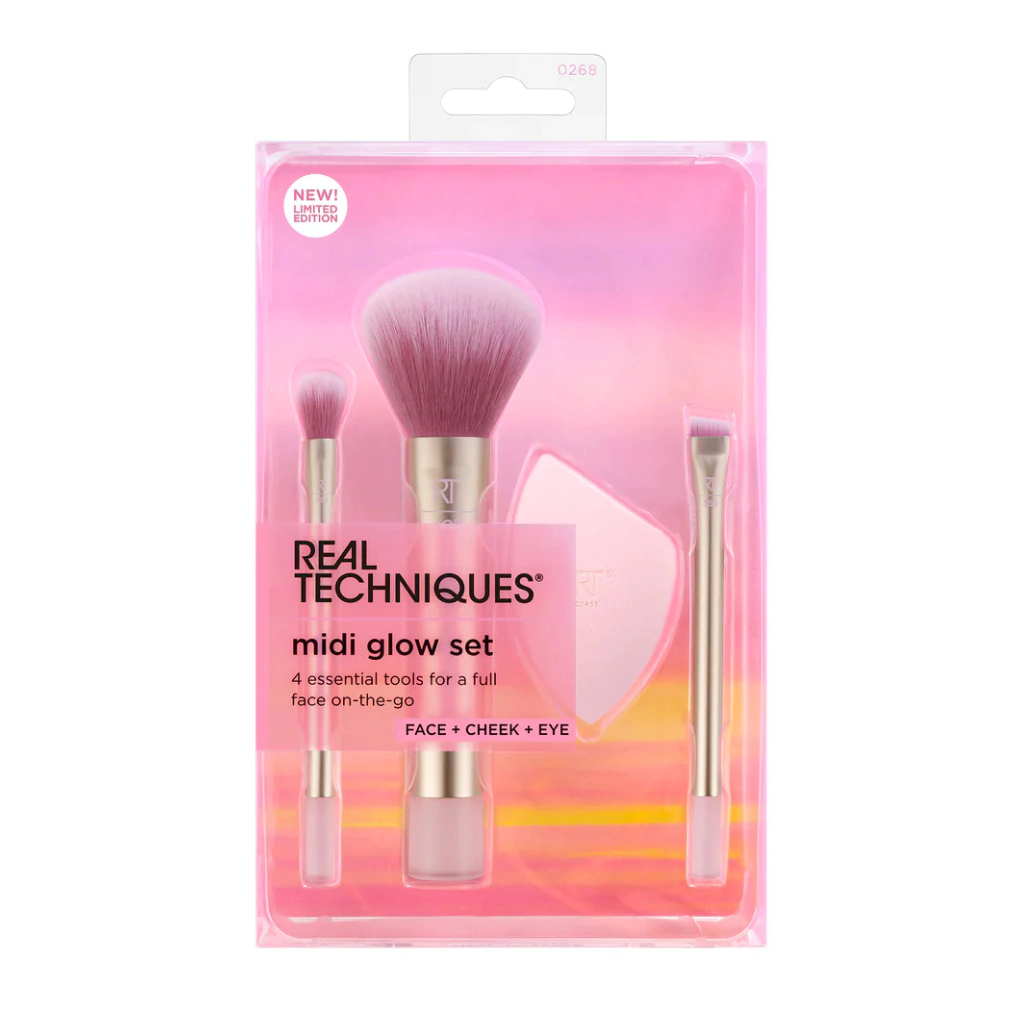 El Sunrise To Sunset Midi Glow Set cuenta con 4 herramientas esenciales para conseguir una luminosidad total sobre la marcha. Las dos brochas para sombras de ojos y la brocha multitarea cubren la mayoría de las necesidades de definición del rostro, mientras que la esponja Miracle Complexion Sponge permite difuminar los productos en crema de forma rápida y sencilla. Estas pequeñas herramientas multitarea funcionan con la mayoría de los productos líquidos, en crema o en polvo, para que puedas conseguir un rostro completo estés donde estés. La esponja Miracle Complexion tiene una forma única de aplicación en 3 puntos y está diseñada con una revolucionaria tecnología de espuma sin látex.